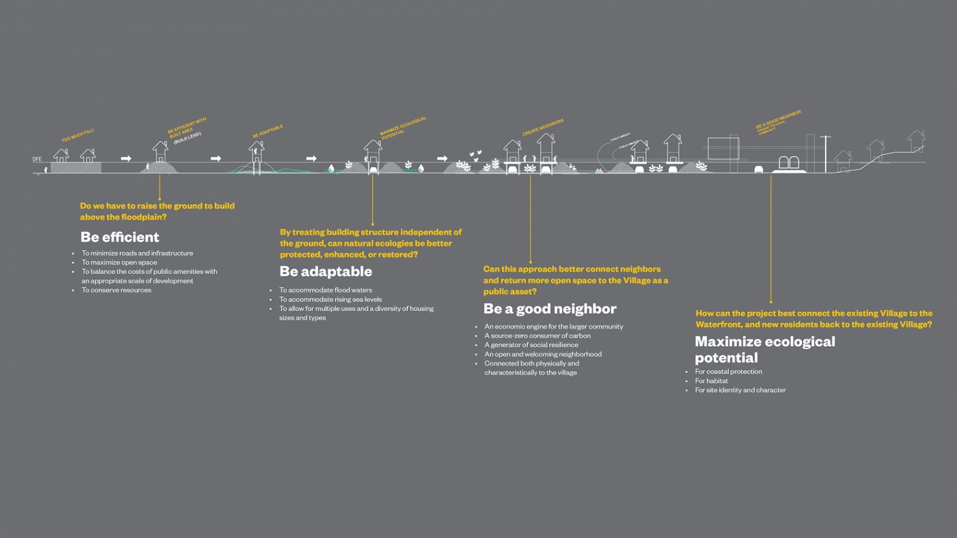 - Build smarter in a flood prone area, developing resilient design strategies that can flexibly respond to long-term climate change and the potential resultant elevated tidal levels;