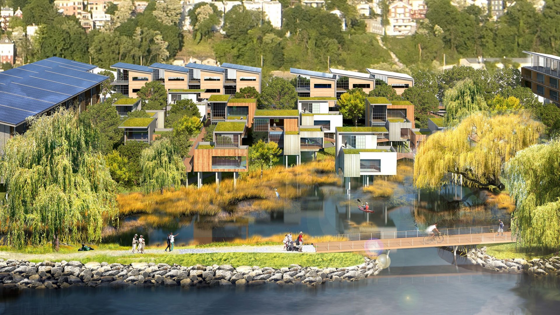 The Wetlands is conceived as an ecological neighborhood that utilizes the investments of new development to maximize the return of natural wetland habitat to this riverfront site, creating an interesting mix of urban living and natural environment. The design of the Wetlands embraces the potential of rising tidal levels, creating an inventive way to build and live at the water’s edge that is respectful of the site’s ecology and echoes many typologies of waterfront villages both historic and contemporary by creating an elevated level of public walkways that will foster interaction between neighbors and provide a resilient path to the adjacent high ground during storm surges and temporary floods, as well as in the event that rising tides permanently elevate the overall levels of the river onto the site.