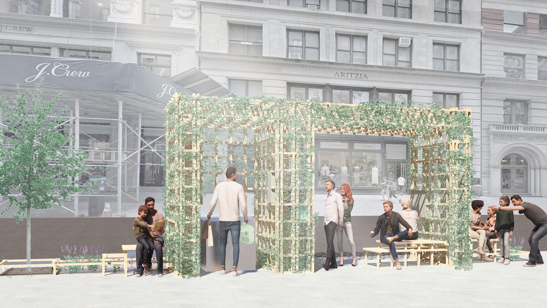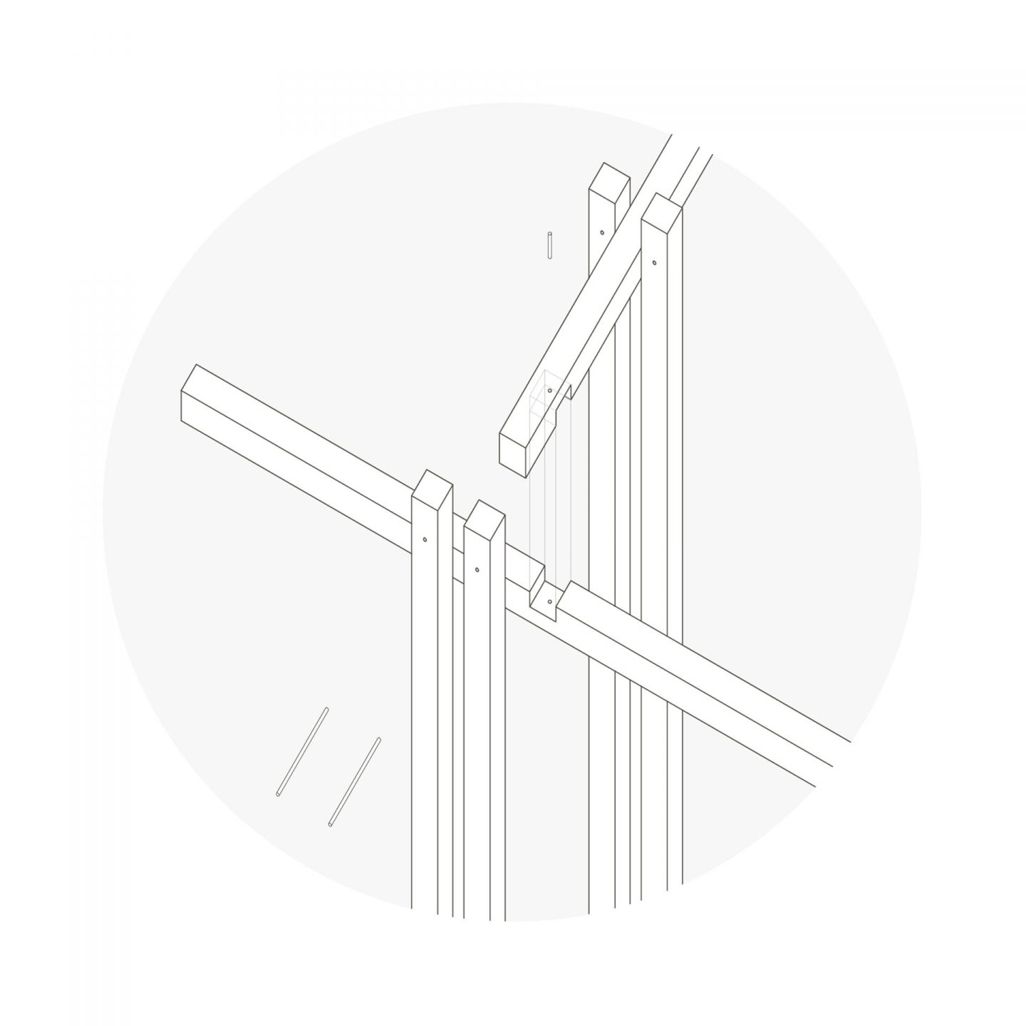 The modular system will allow the shed to grow and host more functions as the demand gradually grows. The materials will be recycled wood framing, offering a comfort of texture and color along the streetscape.
