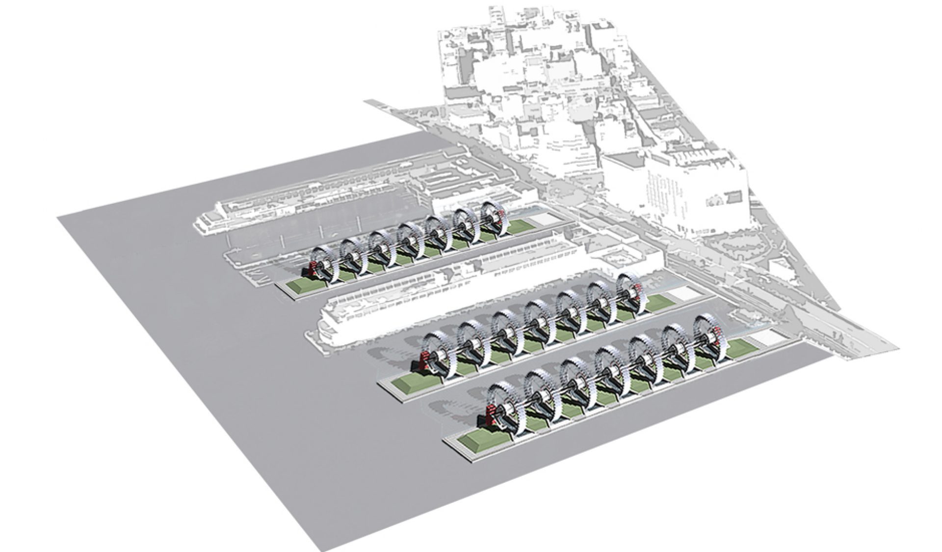 Wheels installed at derelict piers or on permanently moored barges along the riverfront harvest energy, effectively converting kinetic energy to zero-carbon electrical energy. They do so by relying on the time-tested technology of undershot water wheels: the river’s current applies a force to the submerged blades of each wheel, and this force spins the wheels, which, in turn, drive electricalgenerators. The electricity produced is then used to illuminate a system of L.E.D. streetlights.