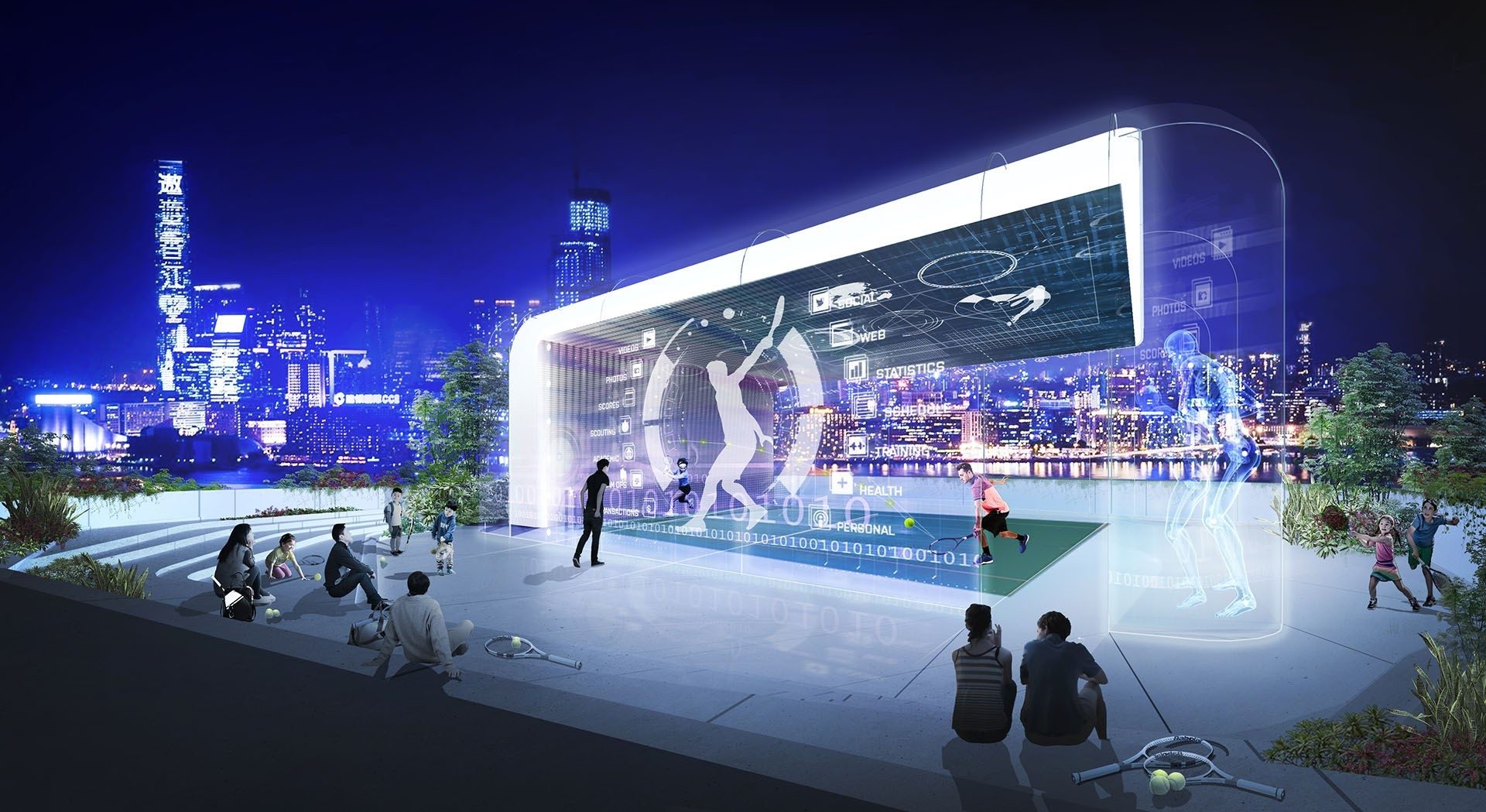 Exciting rapidly developing technologies are moving to a point of synthesis which will transform daily life and architecture. Operable full height glass walls are the screen for a virtual immersive sports environment supported by cameras and high-powered computing. Recent innovations integrated into this design include the latest in glass technology, including oversize glass and switchable glass, screen technology, using transparent screens, and computing, including smart cameras, with supporting high powered analytic software and high speed hardware.