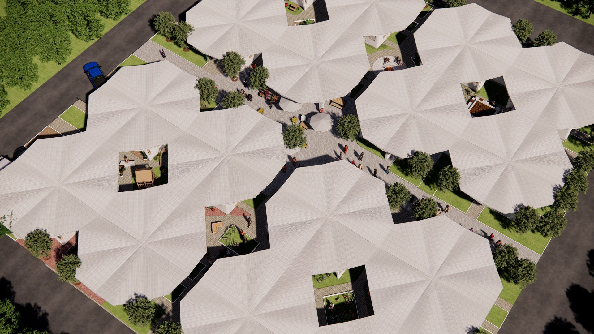 The 3D-printed roof is comprised of arched leaves, designed to be raised into place onto load-bearing walls. The entire structure operates under compression, thereby reducing the necessity for rebar/steel as well as a reduction in our embodied carbon footprint. With the right formulation of concrete, the construction of these homes could even achieve carbon positivity. Furthermore, the roof serves a dual purpose by directing water into a structurally integrated cistern, which can be pumped for irrigation and greywater reuse in the community facilities.