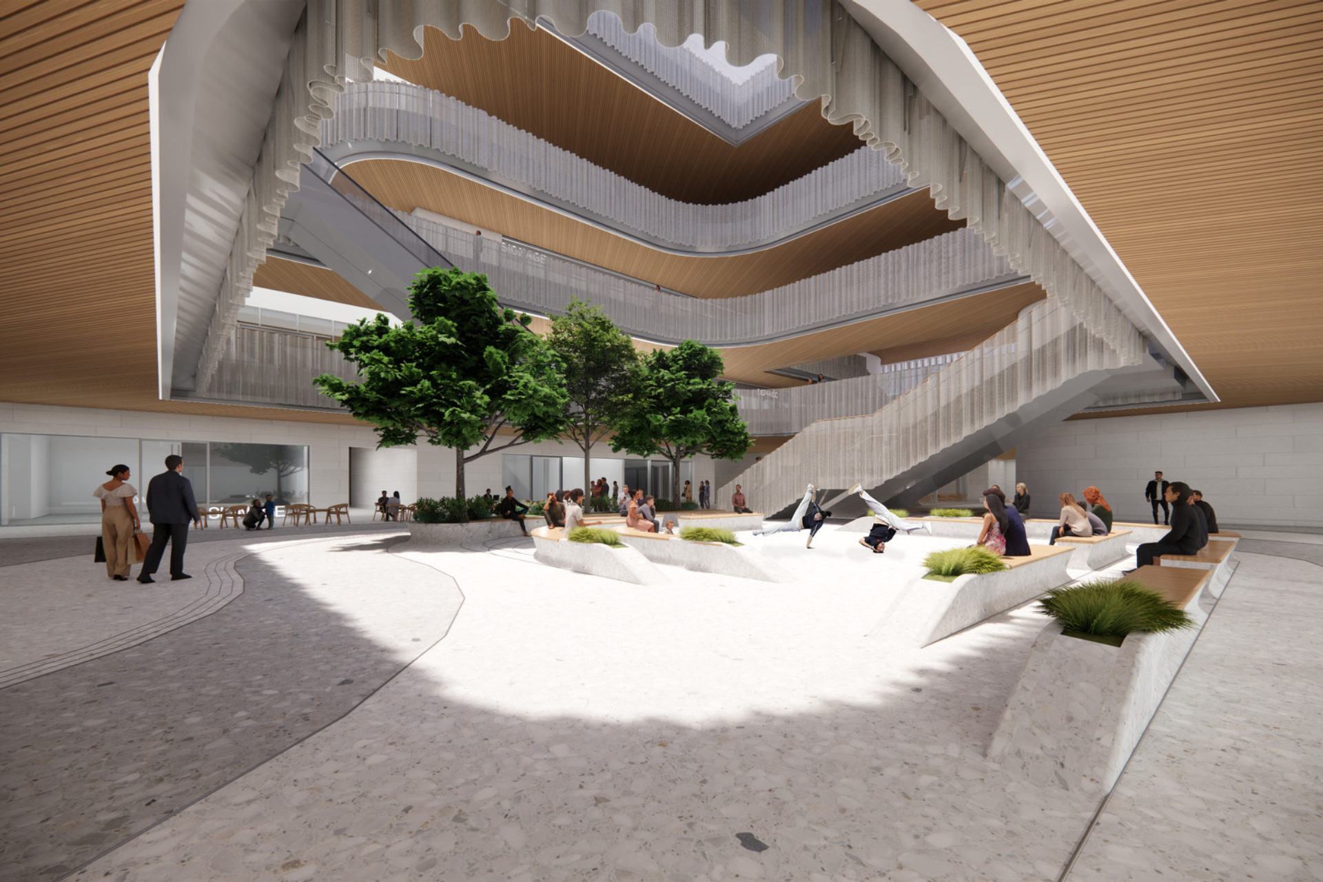 The largest of these volumes—the main lobby—functions as a communal living room that includes an orientation gallery, reception, and visitor amenities. A dramatic, sweeping wood-clad stair, reminiscent of a flowing fabric train, serves as the focal point within the lobby.
