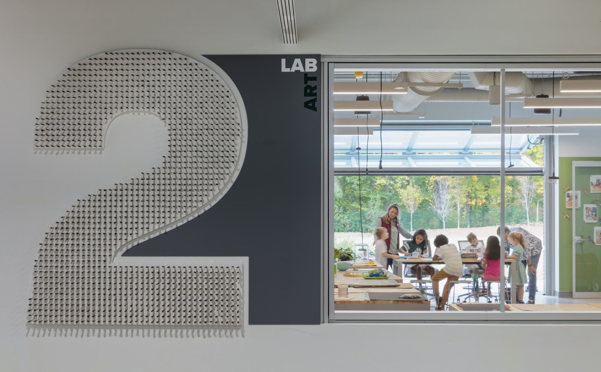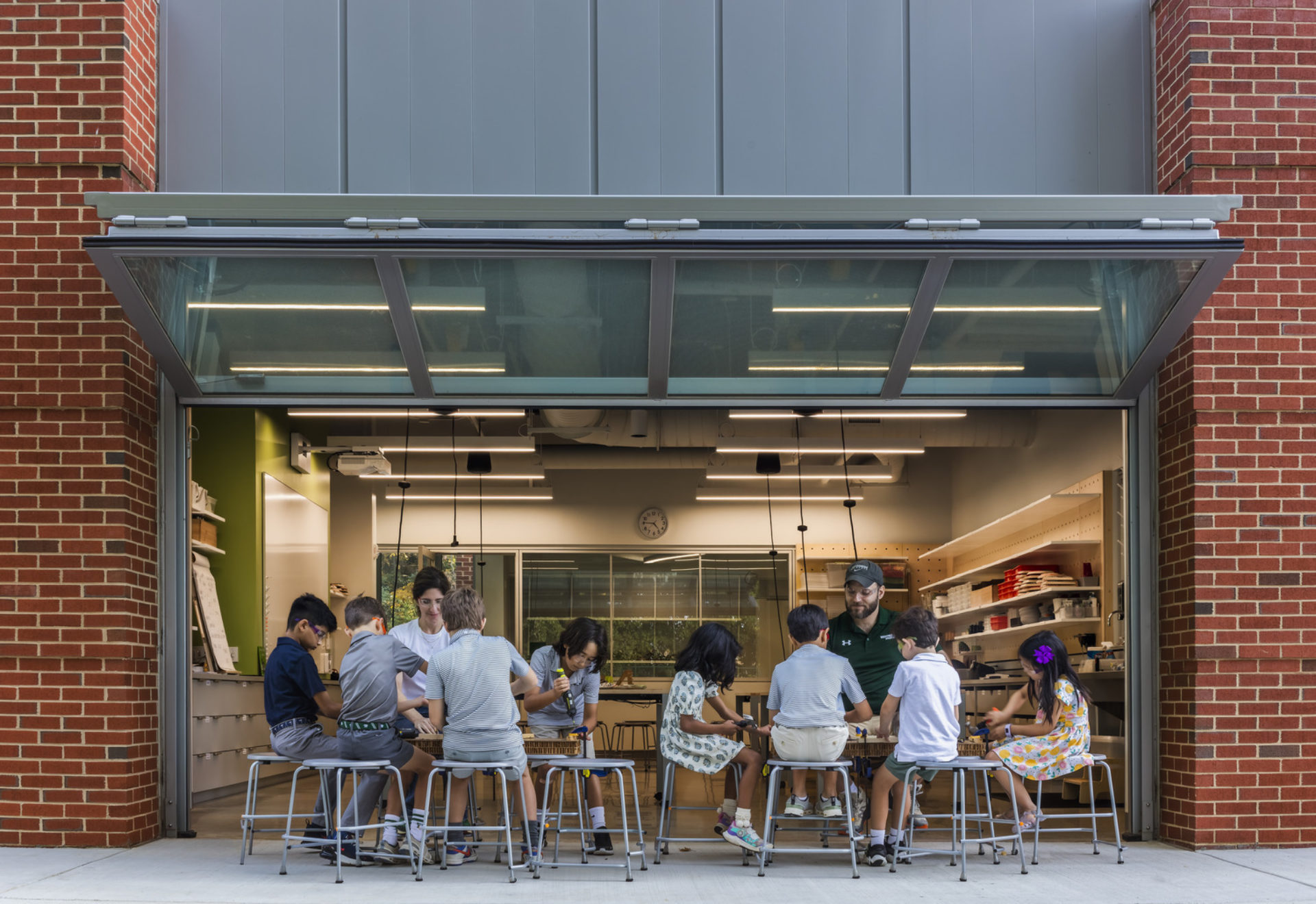 The addition includes a new suite of art and design thinking labs—similar layouts with shared lab prep and support spaces that allow for growth and programming flexibility. Bi-fold garage doors facilitate a seamless indoor-outdoor classroom experience, fostering experimentation and exploration by creating a flexible and dynamic learning environment that expands beyond traditional boundaries. The labs also open to “Group Teach” spaces, fostering collaboration between classrooms and disciplines.